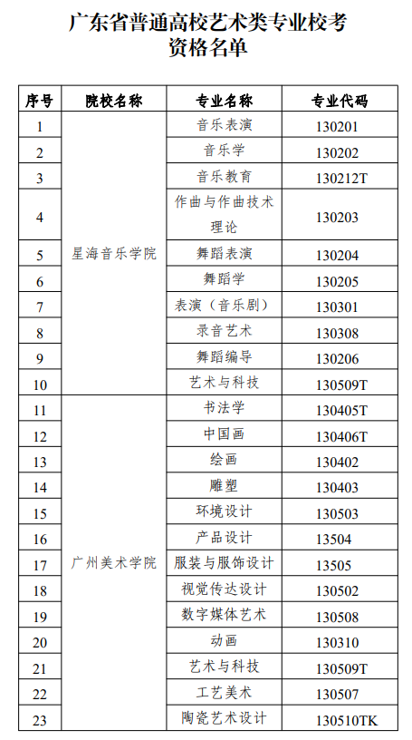 现将广东省普通高校艺术类专业校考资格名单公布如下: