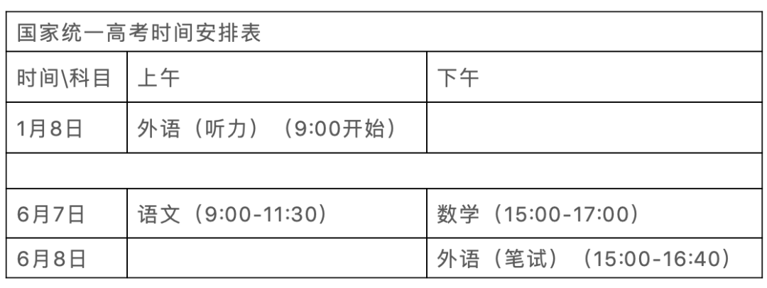 统一高考科目使用全国统一命题试卷,考试时间安排在6月7日全天和6月8日下午,其中语文考试时间为150分钟,数学考试时间为120分钟,外语(笔试)考试时间为100分钟。外语(听力)考试安排在1月8日上午,连续组织两次,每次考试时长约20分钟,考试成绩取两次中的高分计入外语科目成绩。