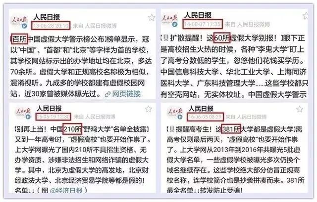此前,人民日报微博曾多次归纳全国“野鸡大学”黑名单。我们发现,“野鸡大学”的名字都和正规大学相差无几。比如,把中国传媒大学改成“中国传媒艺术学院”,反正,传媒和艺术是紧挨在一起的。